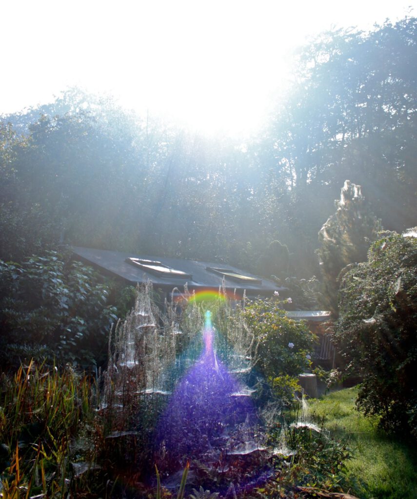 In het midden branden ’s avonds de lantaarntjes die in de eikentakken hangen. Roelien werd geïnspireerd door een bezoek aan het Elohim centrum in